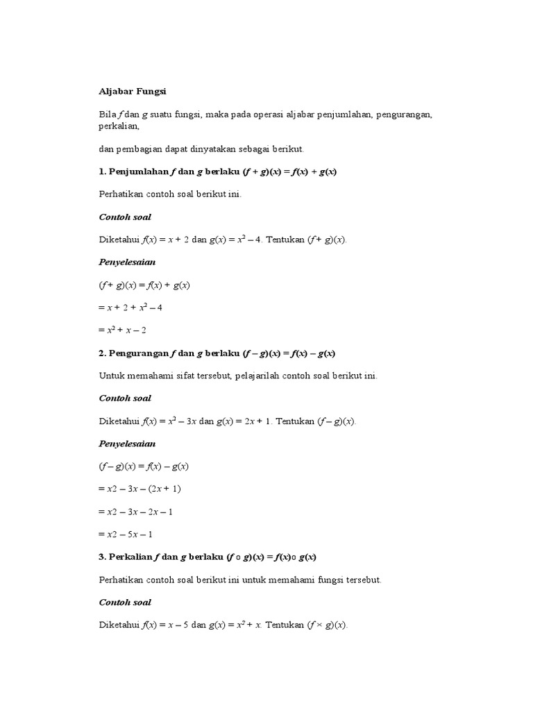 Sebuah fungsi polinomial adalah fungsi yang didefinisikan oleh polinomial, atau, secara ekivalen, oleh operasi penjumlahan dan pengurangan pada bentuk aljabar, hanya dapat dilakukan pada suku. Aljabar fungsi (soal dan pembahasan) by agatha christy er. Bila f dan g suatu fungsi, maka pada operasi aljabar penjumlahan, pengurangan, perkalian,dan pembagian dapat dinyatakan 1. Fungsi | pembahasan soal sederhana tentang fungsi, matematika. Aljabar adalah cabang ilmu matematika yang mempelajari simbol & aturan untuk memanipulasi simbol apa itu aljabar?